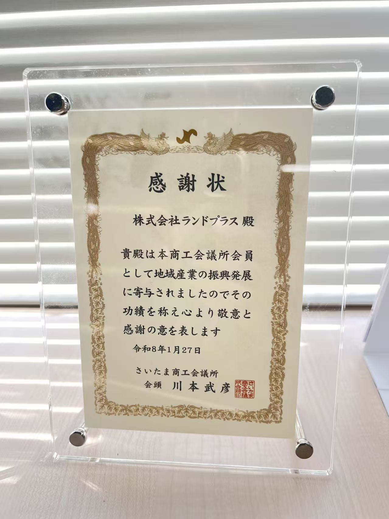 このたび、株式会社ランドプラスはさいたま商工会議所様より感謝状を拝受いたしました。